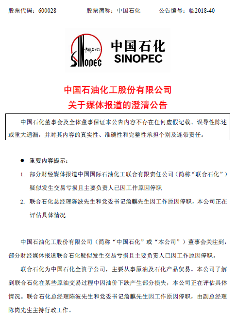 智通財(cái)經(jīng)APP獲悉,中國(guó)石化今日(12月27日)晚間在上交所發(fā)表公告稱,了解到聯(lián)合石化在某些原油交易過(guò)程中因油價(jià)下跌產(chǎn)生部分損失,公司正在評(píng)估具體情況。聯(lián)合石化總經(jīng)理陳波先生和黨委書記詹麒因工作原因停職,由副總經(jīng)理陳崗主持行政工作。此外,中國(guó)石化還表示,目前公司生產(chǎn)經(jīng)營(yíng)情況一切正常。(林雅蕓)