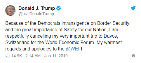 特朗普表示,由于民主黨在邊境安全問題上的頑固態(tài)度和國家安全的重要性,他謹慎地取消前往瑞士達沃斯參加世界經濟論壇的行程,并向世界經濟論壇致以問候和歉意。另外,美國政府高級官員表示,即使本月晚些時候政府仍處于關閉狀態(tài),美國財政部長姆努欽將帶領美國政府代表團出席達沃斯論壇。