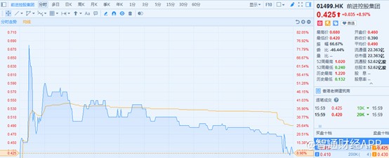 智通財經(jīng)APP獲悉,1月10日停牌的前進控股集團(01499)于24日復牌,股市反響劇烈,開盤十分鐘曾一度暴漲74.56%,不過隨后不斷滑落,截止16時45分,報港元0.425元(下同),較停牌日收盤價0.39元僅有9%的增幅。