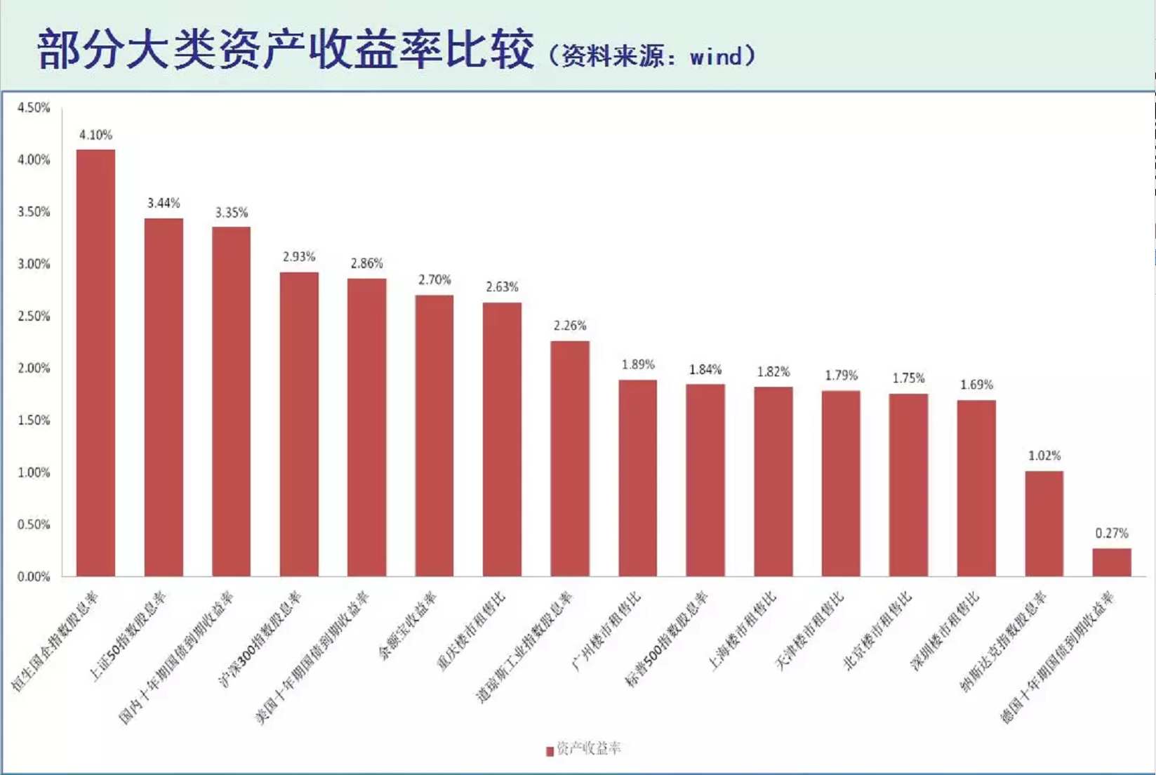 買恒生國(guó)企可以有4.1%的收益率,上證50有3.44%的收益率,10期國(guó)債是3.14%的收益率,然而,買上海、北京的房產(chǎn),收益率分別是1.82%、1.75%,買深圳的房產(chǎn)收益率更是只有1.69%。作為對(duì)比,余額寶的收益率都有2.7%。