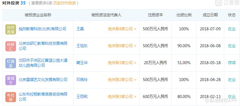 不過,在內(nèi)地業(yè)務(wù)上,該公司今后的發(fā)展方向或也會出現(xiàn)一些變化,教育衍生品或?qū)⑹窃摴就顿Y方向,以該公司2018年投資的標(biāo)的來說,根據(jù)企查查的數(shù)據(jù),該公司投資成立的大部分是教育相關(guān)的服務(wù)。以下為企查查搜到的紅黃藍2018年投資成立的項目: