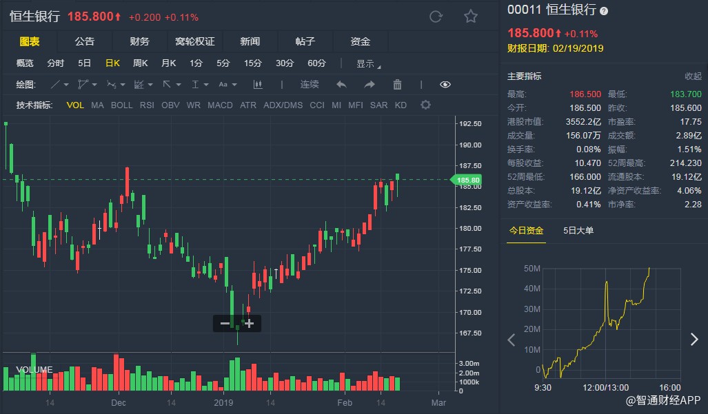 截至發(fā)稿,恒生銀行(00011)微升0.11%,報185.800港元。(劉大洋)