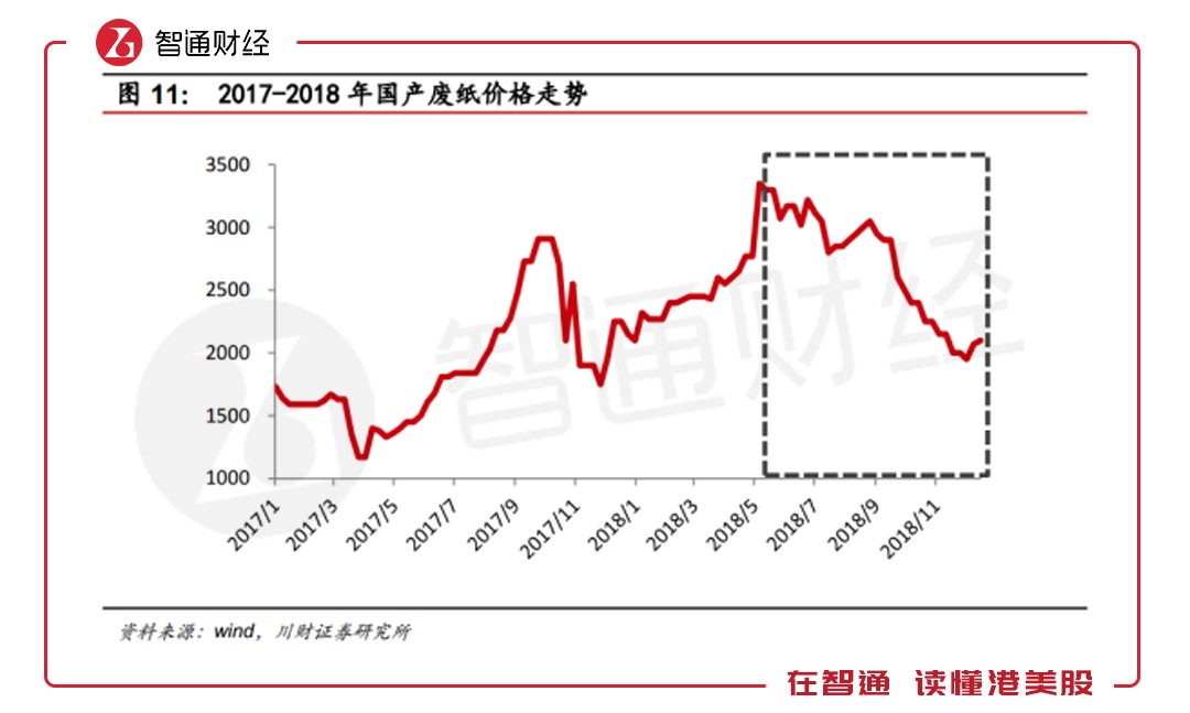 而在2018年,進口廢紙配額大幅減少及質(zhì)量要求的收緊,導(dǎo)致了進口及國內(nèi)廢紙的供應(yīng)及價格均出現(xiàn)急劇波動。因此售價在業(yè)績期間內(nèi)出現(xiàn)普遍下跌,造成盈利能力的下跌。且據(jù)券商預(yù)計,2019年外廢進口政策將繼續(xù)收緊,到2020年將全面禁止外廢進口,這將進一步對紙業(yè)原材料價格產(chǎn)生影響。