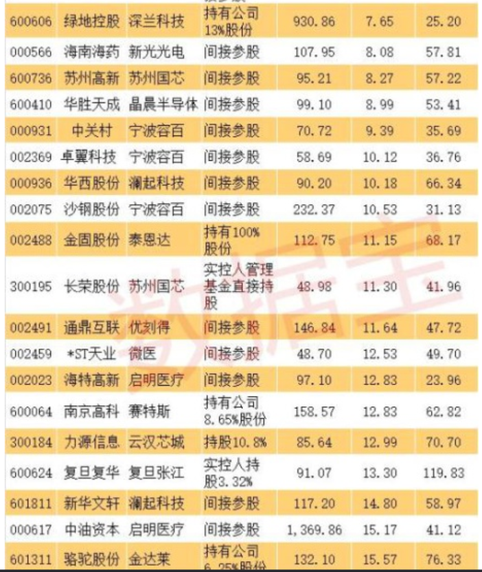 科創(chuàng)板影子股:首批創(chuàng)業(yè)板潛在公司背后有超過(guò)50只影子股,而這些影子股大多是間接持股。從持股比例來(lái)看,最大的是金固股份,持有泰恩達(dá)100%股權(quán)。其他影子股持股比例較大的還有,通化東寶持有33.94%特寶生物、上海醫(yī)藥持有26%復(fù)旦張江、三六零持有22.59%奇安信科、張江高科間接持有10.78%上海微電子、綠地控股持有13%深蘭科技、力源信息持有10.8%云漢芯城、科大國(guó)創(chuàng)持有10.15%譽(yù)存科技、南京高科持有8.65%賽特斯、駱駝股份持有6.25%金達(dá)萊等。