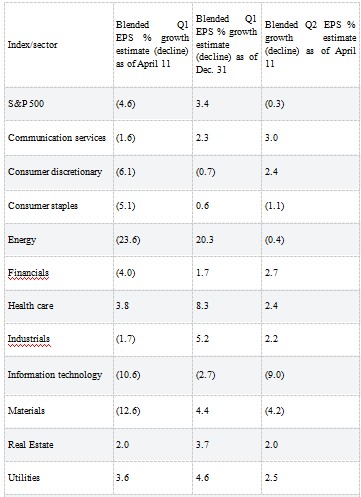 截至上周三下午,標準普爾500指數(shù)成份股的505家企業(yè)中有25家公布了業(yè)績,綜合增長預期為-4.6%,11個行業(yè)中有8個預計每股收益將同比下降。這大大低于截至12月31日預計的增幅(3.0%)。