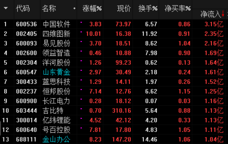 周三資金凈流入超1億公司:黃金、低位科技股;