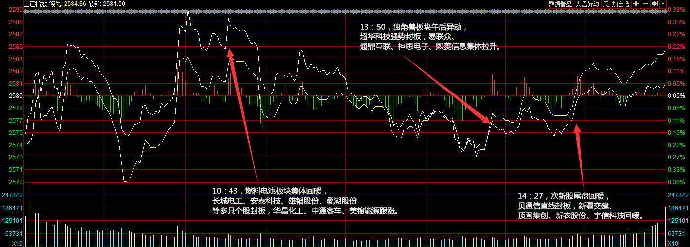 指數(shù)今日小幅低開(kāi),開(kāi)盤(pán)后不久在燃料電池、汽車(chē)等板塊的帶領(lǐng)下,三大指數(shù)積極上攻一度翻紅,但做多動(dòng)能未能持續(xù)沖高回落。午后指數(shù)弱勢(shì)盤(pán)整,創(chuàng)投、次新股輪番拉升,但未改兩市橫盤(pán)局面。個(gè)股漲跌參半。