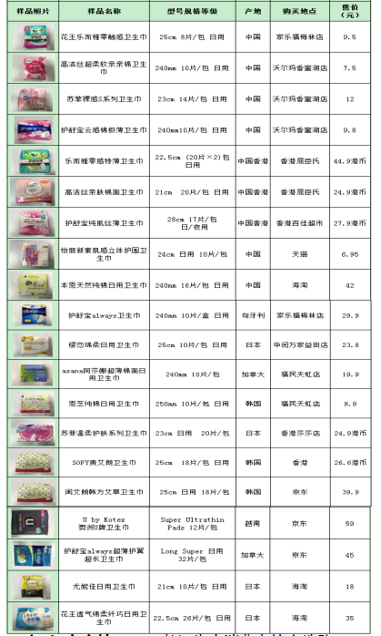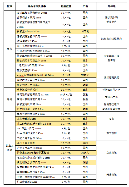 據前期調研發(fā)現,國外品牌衛(wèi)生巾更受女性消費者青睞,很多消費者認為國外品牌衛(wèi)生巾質量更優(yōu)更值得信賴,進而選擇跨境或海淘等方式購買國外產品。因此,本次樣品分別從深圳商超、香港、線上海淘購買樣品進行測試和比較,樣品涉及11款國外原裝產品。詳見下表。