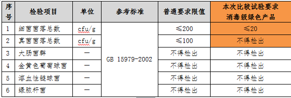 1.微生物指標為目前國際上檢驗衛(wèi)生巾商品衛(wèi)生質量最為嚴格的綠色產品評價標準“消毒級”要求。“消毒級”要求細菌菌落總數低于國家標準要求10倍。