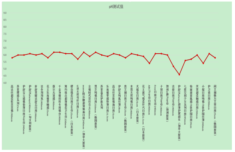 女性特殊時期的抗病能力大大降低,而與皮膚密切接觸的衛(wèi)生巾的酸堿度即pH值是關乎女性特殊時期健康的重要因素。據婦幼保健醫(yī)生介紹,衛(wèi)生巾的pH值在弱酸性至堿性對人體最安全。本次比較試驗35款衛(wèi)生巾pH值測試結果均在4.5到6.5之間,對人體無害。pH值測試結果見下圖。