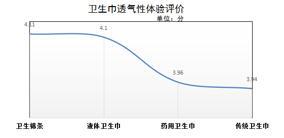 在本次主觀體驗透氣性方面,衛(wèi)生棉條評價最高,平均得分4.11分;其次是液體材料衛(wèi)生巾,平均得分4.1分;藥用衛(wèi)生巾和傳統型衛(wèi)生巾透氣性評價稍遜,平均得分分別為3.96和3.94分。