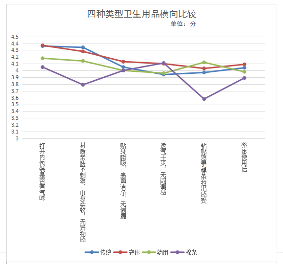 本次衛(wèi)生巾比較試驗共招募150名目前沒有從事有關衛(wèi)生巾行業(yè)的年齡介于16-45歲之間的消費者分別對傳統型衛(wèi)生巾、新型衛(wèi)生巾(液體材料衛(wèi)生巾)、衛(wèi)生棉條、功能性(藥用)衛(wèi)生巾四種類型商品進行體驗。要求體驗消費者對所使用的衛(wèi)生用品進行1-5分的評價(1分最低,5分最高),主要體驗內容及感受如下: