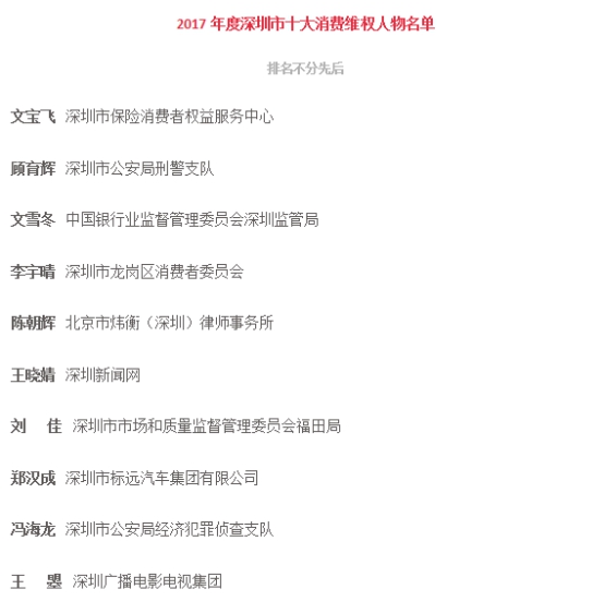 現(xiàn)經(jīng)人物推薦、專家初審、網(wǎng)絡(luò)投票審議通過,文寶飛等10名同志為“2017年度深圳市十大最美消費維權(quán)人物”,謝婧等10名同志為“2017年度深圳市十大最美消費維權(quán)人物” 提名。