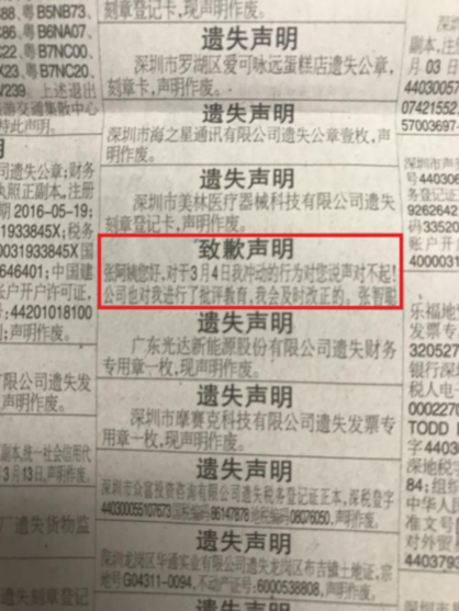 在3月24日的報紙上,記者在整版密密麻麻的分類信息中,終于找到了埋藏在其中的一條“致歉聲明”——“張阿姨您好,對于3月4日我沖動的行為對您說聲對不起!公司也對我進行了批評教育,我會及時改正的。”記者聯(lián)系該版服務(wù)熱線,對方表示登報這則致歉聲明的價格為200元左右。(田志強)