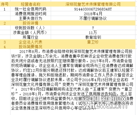 2017年8月,市消委會陸續(xù)收到深圳花皇藝術(shù)傳媒管理有限公司投訴7宗,涉及金額11萬余元,消費者集中反映該企業(yè)收受消費者預(yù)付款后關(guān)閉分店或者無法按照約定繼續(xù)履行服務(wù)。2017年8月,市消委會組織現(xiàn)場調(diào)解會,該企業(yè)法人王建軍在調(diào)解會現(xiàn)場與三位消費者達成調(diào)解協(xié)議,約定12月份前分期退還預(yù)付款。達成調(diào)解協(xié)議后王建軍以經(jīng)營不善等理由推諉、拖欠和拒絕退款,期間市消委會工作人員多次督促該企業(yè)及時履行調(diào)解協(xié)議退款未果。該公司于2016年4月15日將企業(yè)名稱 “深圳花皇文化傳播有限公司”變更為“深圳花皇藝術(shù)傳媒管理有限公司”; 2017年9月5日調(diào)解期間將法定代表人由“王建軍”變更為“章衛(wèi)珍”。2018年1月,市消委會向該企業(yè)發(fā)送了信用推送告知函,無人簽收,目前該企業(yè)已被市場監(jiān)管委列入經(jīng)營異常名錄。依據(jù)《深圳市消費者委員會消費維權(quán)信用信息管理辦法(試行)》第九條,市消委會將該企業(yè)信息推送至深圳市公共信用中心等征信機構(gòu)。該企業(yè)雖然變更了公司名稱和法定代表人等公司信息,但仍需承擔(dān)原企業(yè)未履行的法定或約定義務(wù)。