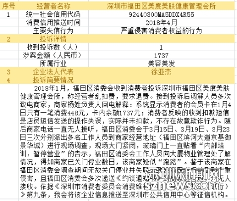 2018年1月,福田區(qū)消委會收到消費者投訴深圳市福田區(qū)美度美膚健康管理會所,稱經(jīng)營者亂扣費,要求退回余額(會員卡余額1737元)。接到投訴后調(diào)解人員多次致電商家,商家楊姓負(fù)責(zé)人回電解釋:系統(tǒng)顯示消費者的會員卡在1月4日只有一筆消費448元,卡內(nèi)余額1737元;消費者反映的收到扣款短信是店員短信發(fā)送的操作失誤,實際并未扣款,不存在故意欺詐行為。隨后商家電話一直無人接聽,福田區(qū)消委會于3月15日、3月19日、3月23日三次分別派出多名工作人員到商家經(jīng)營地址(福田區(qū)濱河大道京基御景華城)進行現(xiàn)場調(diào)查,現(xiàn)場大門緊閉,玻璃門上一直貼著“內(nèi)部培訓(xùn),暫停營業(yè)”的告示,福田區(qū)消委會工作人員向大廈物業(yè)管理處了解情況,得知商家已關(guān)門停業(yè)數(shù)日,該商家疑似“跑路”。鑒于該商家在福田區(qū)消委會調(diào)查期間無故關(guān)門停業(yè)并失聯(lián),致使消費者權(quán)益受到嚴(yán)重侵害,且福田區(qū)消委會多次遞送《約談通知書》到商家經(jīng)營地,均無人接收。依據(jù)《深圳市消費者委員會消費維權(quán)信用信息管理辦法(試行)》第九條,我會將該企業(yè)信息推送至深圳市公共信用中心等征信機構(gòu)。