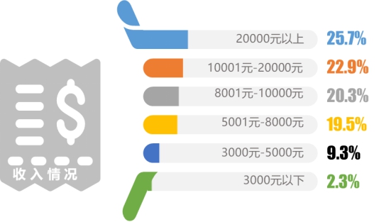 本次調研中,公司管理人員的比例最高,為19.4%,其次是公司一般職員,占比為18.4%;68.9%的受訪者其個人月收入超過8000元。