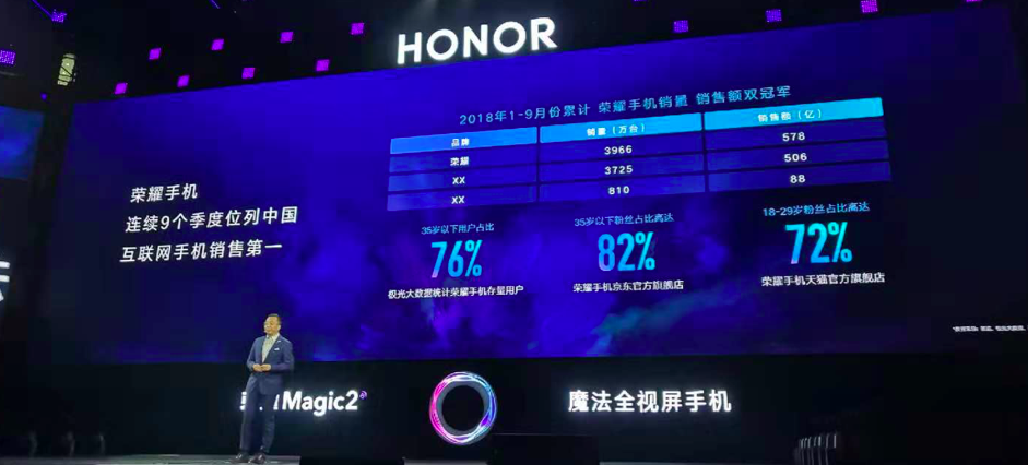 2018年,在全球智能手機市場增長遇冷的大勢下,榮耀繼續(xù)乘風(fēng)破浪的亮眼表現(xiàn)。在國內(nèi)市場,連續(xù)9個季度位列中國互聯(lián)網(wǎng)手機銷售第一,進一步夯實互聯(lián)網(wǎng)手機第一品牌的地位。據(jù)賽諾數(shù)據(jù)顯示,2018年1-9月,榮耀手機以3966萬臺的銷量、578億元的銷售額,雙雙進入中國手機市場的前五,這也是唯一入圍TOP5的互聯(lián)網(wǎng)手機品牌。同時,榮耀在全球74個國家市場以榮耀模式縱深布局、深度耕耘,強勢進入快速增長通道。