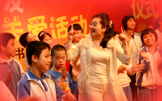 十年堅(jiān)持義務(wù)為盲童教唱的愛心藝術(shù)家鄭海燕與盲童在一起