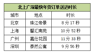 11.平均不出50分鐘,消費者就能收到最新鮮的年貨,年貨訂單最快8分17秒送到家。