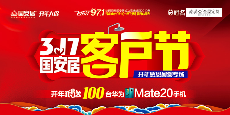 國(guó)安居一直心懷感恩,感謝十多年來累計(jì)30萬老客戶的信賴與支持,此次活動(dòng)不僅是為了品牌優(yōu)惠,更多的是給老客戶送去關(guān)懷和福利。國(guó)安居特聯(lián)合深圳電臺(tái)971王牌節(jié)目一路飛揚(yáng)鼎力巨獻(xiàn),聯(lián)手旗下百位工廠總裁打造開年大促,推出多重優(yōu)惠:1、開年狠送100臺(tái)華為mate20手機(jī);2、聯(lián)購(gòu)滿額返100萬現(xiàn)金,上不封頂?shù)瘸祷仞伝顒?dòng),以3.15為契機(jī)來回饋多年來關(guān)注國(guó)安居、支持國(guó)安居的廣大消費(fèi)者,以最大限度的優(yōu)惠、最為超值的實(shí)惠、最為驚喜的鉅惠獻(xiàn)禮3.17大促!
