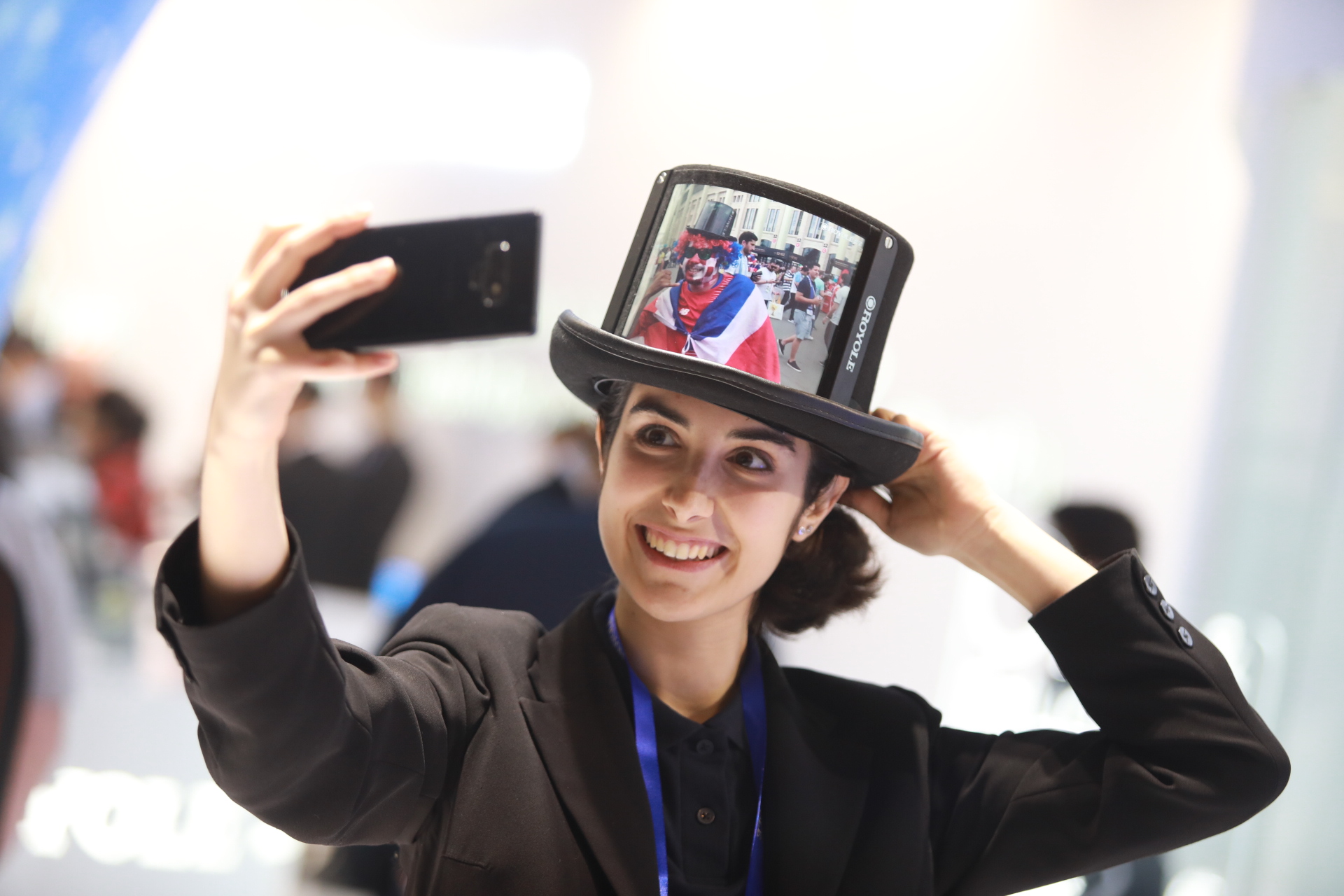 法國(guó)一女士體驗(yàn)高清柔性屏?xí)r尚衣帽后對(duì)柔宇工作人員說(shuō):"柔性屏?xí)r尚衣帽套裝超酷,這個(gè)如果能穿去派對(duì)的話就太完美了。"