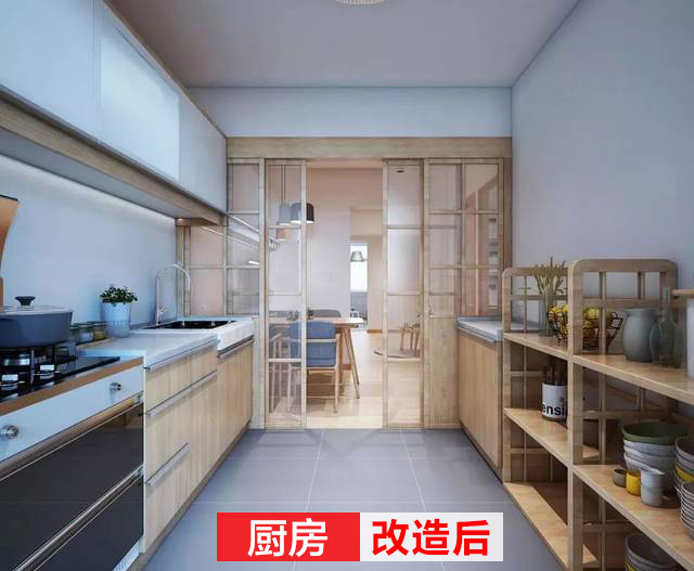 改造后的廚房干凈利索,各個功能區(qū)分明顯,木質(zhì)的隔板、柜子實(shí)用美觀,還利用玻璃移門分隔了廚房與外部。