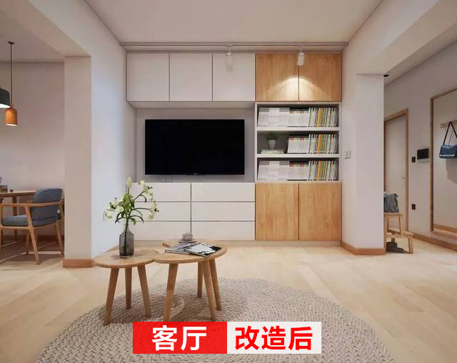 改造后的客廳同樣干凈簡潔,打造一面電視柜做儲物,抽屜+儲物柜+書柜的設(shè)計(jì),能夠滿足客廳的收納需求。