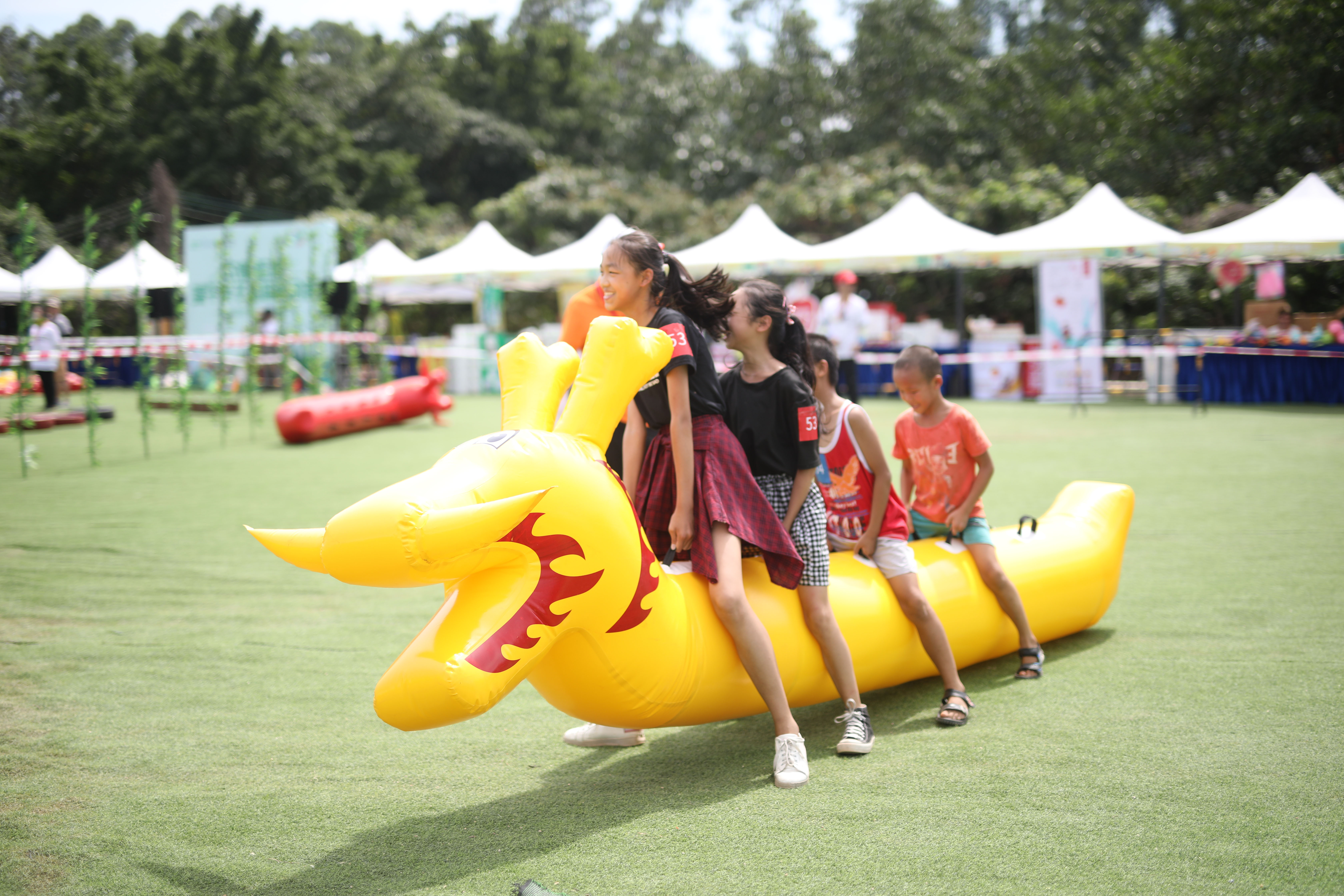 家長小朋友共騎在龍舟上用腳往前沖,有的隊伍步調一致,快速地奔向終點,贏得觀眾的齊聲喝彩而有的隊伍則踉踉蹌蹌,引起觀眾陣陣笑聲。