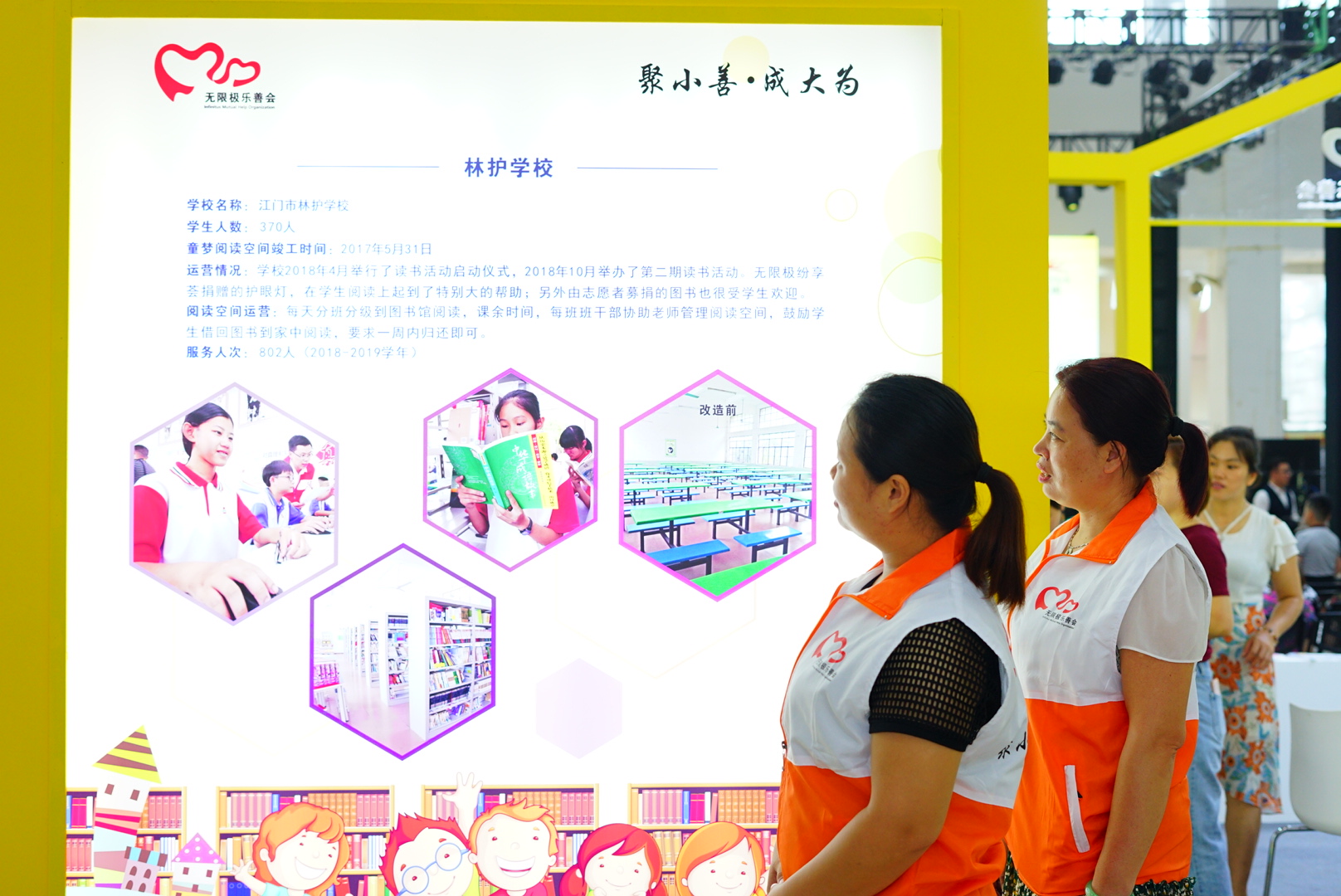 在南國(guó)書(shū)香節(jié)江門(mén)分會(huì)場(chǎng)的場(chǎng)館中央,“黃色小屋”尤其吸人眼球。在項(xiàng)目展示上,無(wú)限極樂(lè)善會(huì)多年來(lái)一直關(guān)注鄉(xiāng)村兒童的閱讀教育問(wèn)題,自2015年起,攜手江門(mén)市相關(guān)政府部門(mén)發(fā)起了童夢(mèng)閱讀空間公益項(xiàng)目,致力于兒童閱讀空間建設(shè)及校內(nèi)閱讀推廣工作。在展區(qū),可以看到五所童夢(mèng)閱讀空間的運(yùn)營(yíng)等基本情況。