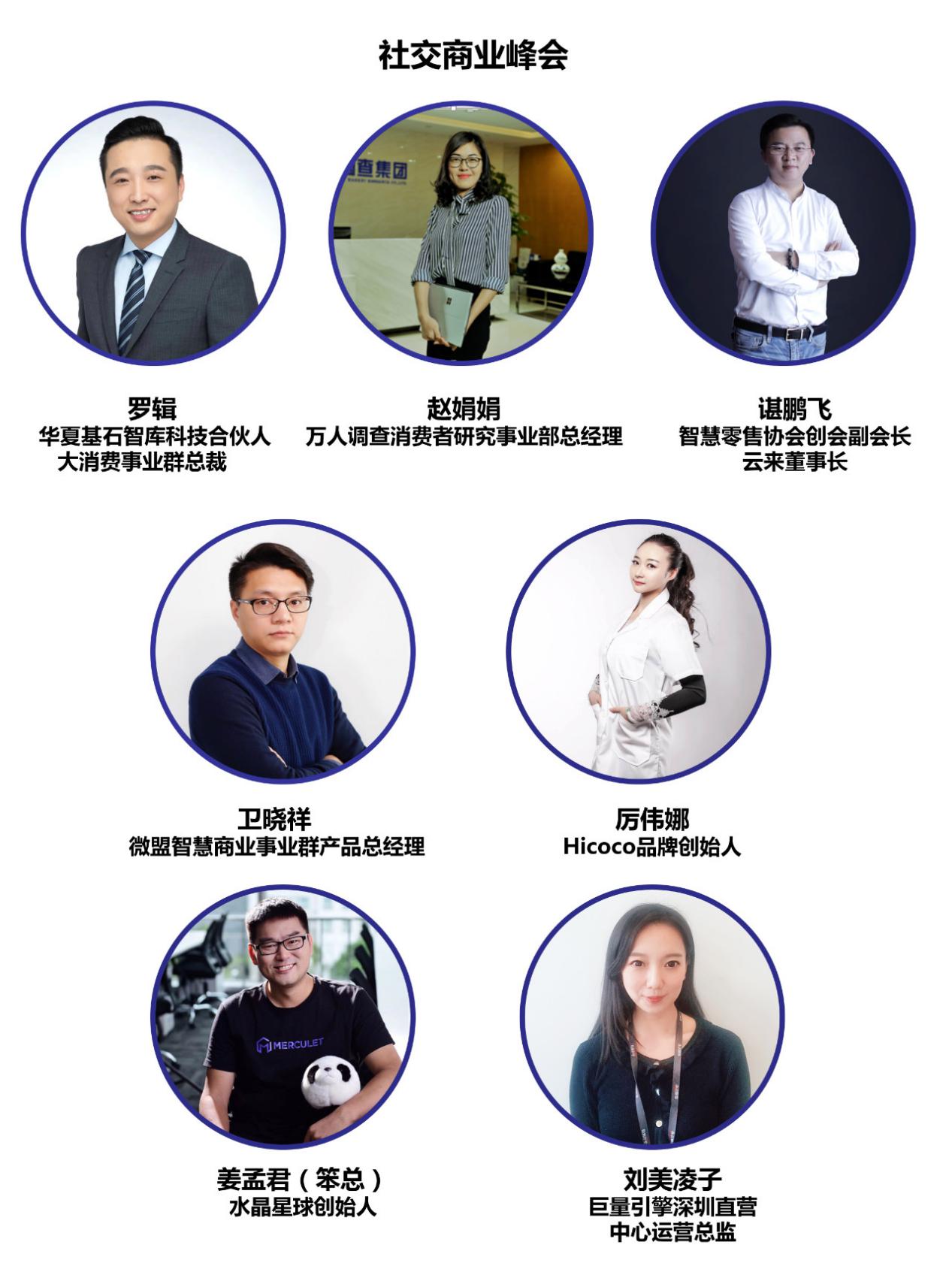 10月30日14:00—17:00(宴會(huì)廳Ⅲ)舉行社交電商峰會(huì),華夏基石智庫(kù)科技合伙人、大消費(fèi)事業(yè)群總裁羅 輯主持峰會(huì)。萬(wàn)人調(diào)查消費(fèi)者研究事業(yè)部總經(jīng)理趙娟娟演講主題《2019年深圳市消費(fèi)者線(xiàn)上線(xiàn)下渠道消費(fèi)洞察》,智慧零售協(xié)會(huì)創(chuàng)會(huì)副會(huì)長(zhǎng)、特聘專(zhuān)家;云來(lái)董事長(zhǎng)諶鵬飛演講主題《私域流量社交商業(yè)模式解碼》,微盟智慧商業(yè)事業(yè)群產(chǎn)品總經(jīng)理衛(wèi)曉祥演講主題《企業(yè)布局社交電商的四種模式》,Hicoco品牌創(chuàng)始人厲偉娜演講主題《說(shuō)說(shuō)美業(yè)那些事》,水晶星球創(chuàng)始人姜孟君演講主題《社群時(shí)代的影響力和業(yè)績(jī)?cè)鲩L(zhǎng)》,巨量引擎深圳直營(yíng)中心運(yùn)營(yíng)總監(jiān)劉美凌子演講主題《D造營(yíng)銷(xiāo)新零售助力品牌升級(jí)布局》