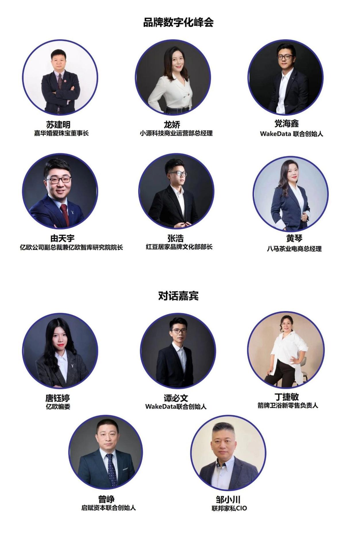 10月30日14:00—17:00(宴會(huì)廳Ⅱ)舉行品牌數(shù)字化峰會(huì),由嘉華婚愛(ài)珠寶董事長(zhǎng)蘇建明主持。小源科技商業(yè)運(yùn)營(yíng)部總經(jīng)理龍嬌演講主題《企業(yè)AI場(chǎng)景化服務(wù)之道》 WakeData聯(lián)合創(chuàng)始人黨海鑫演講主題《喚醒數(shù)據(jù)讓企業(yè)更懂自己的用戶(hù)》,億歐公司副總裁兼億歐智庫(kù)研究院院長(zhǎng)由天宇演講主題《品牌的技術(shù)創(chuàng)新與潮流變革》,紅豆居家品牌文化部部長(zhǎng)張浩演講主題《基于用戶(hù)的品牌數(shù)字化升級(jí)》,八馬茶業(yè)電商總經(jīng)理黃琴演講主題待定。圓桌對(duì)話(huà)由億歐編委唐鈺婷主持,對(duì)話(huà)嘉賓包括WakeData聯(lián)合創(chuàng)始人譚必文,啟賦資本聯(lián)合創(chuàng)始人曾 崢,箭牌衛(wèi)浴新零售負(fù)責(zé)人丁捷敏,聯(lián)邦家私CIO鄒小川。