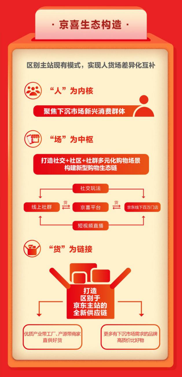 今年,京東打造了區(qū)別于京東主站現(xiàn)有場景和模式的全新平臺(tái)——京喜,于9月19日正式上線。京喜聚焦于下沉新興市場消費(fèi)人群,通過高質(zhì)價(jià)比好貨及豐富的社交玩法,與京東主站實(shí)現(xiàn)了“人”、“貨”、“場”的差異化互補(bǔ)。
