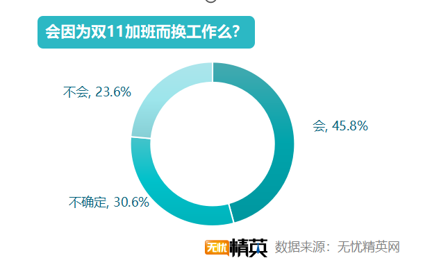 雙11過于辛苦,不少人會有工作上逃離雙11的想法。45.8%的職場精英因為雙11加班過多,會有換工作的想法,不過,較2018年50.6 %的人有這種想法,已有所下降;30.6%的精英不確定要不要換工作,23.6%的職場精英則表示不會因為雙11加班多而換工作。
