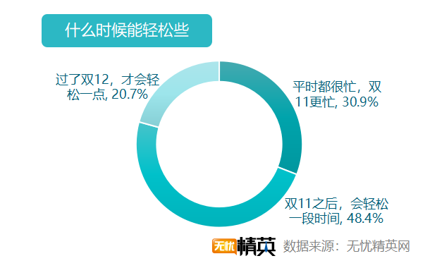 忙碌是工作的常態(tài),雙11只是更忙一點罷了。48.4%的受訪者表示雙11以后,會輕松一段時間;30.9%的職場精英表示,平時都很忙,只是雙11更加忙碌罷了;而20.7%的人,要過了雙十二才會輕松一點。年底的市場,一直是商家們的戰(zhàn)場,雙11以后,雙12、圣誕節(jié)、元旦、春節(jié)接踵而至,輕松只是短暫的停留,促銷才是長期的工作。