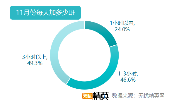 因為雙11而加班的職場精英中,有49.3%的人,11月上旬平均每天需要加班3小時以上,別人忙著購物,而他們忙著加班;46.6%的人,加班時間1-3小時;24%的人,每天加班時間在1小時以內(nèi)。雙11的前兩天往往是最緊張的,今年恰好是周末,加班也由晚上加班,變成了全天加班,從業(yè)者更是辛苦一些。