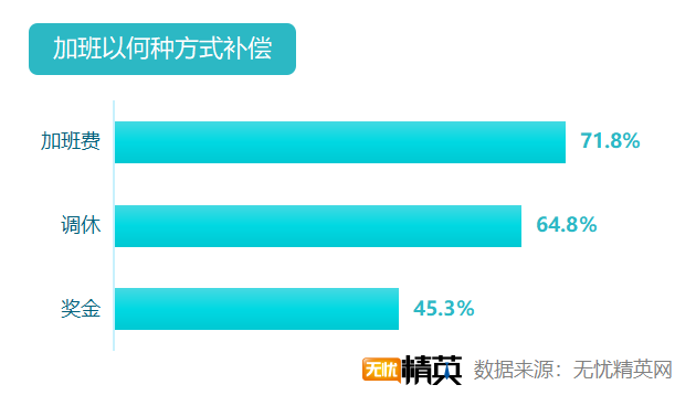 幾乎所有雙11加班的職場精英都能獲加班補償,更有31.4%人能獲得兩項或更多的補償。71.8%的職場精英可以獲得加班費;64.8%的人獲得調(diào)休;45.3%的人會獲得額外的獎金。