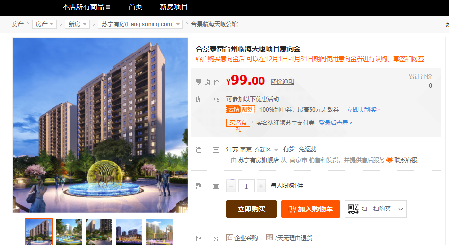 購(gòu)房者在蘇寧易購(gòu)首頁(yè)進(jìn)入“新房特惠”專(zhuān)題,選擇意向房源,購(gòu)買(mǎi)99元意向金之后,可優(yōu)先購(gòu)買(mǎi)雙十二特價(jià)房。