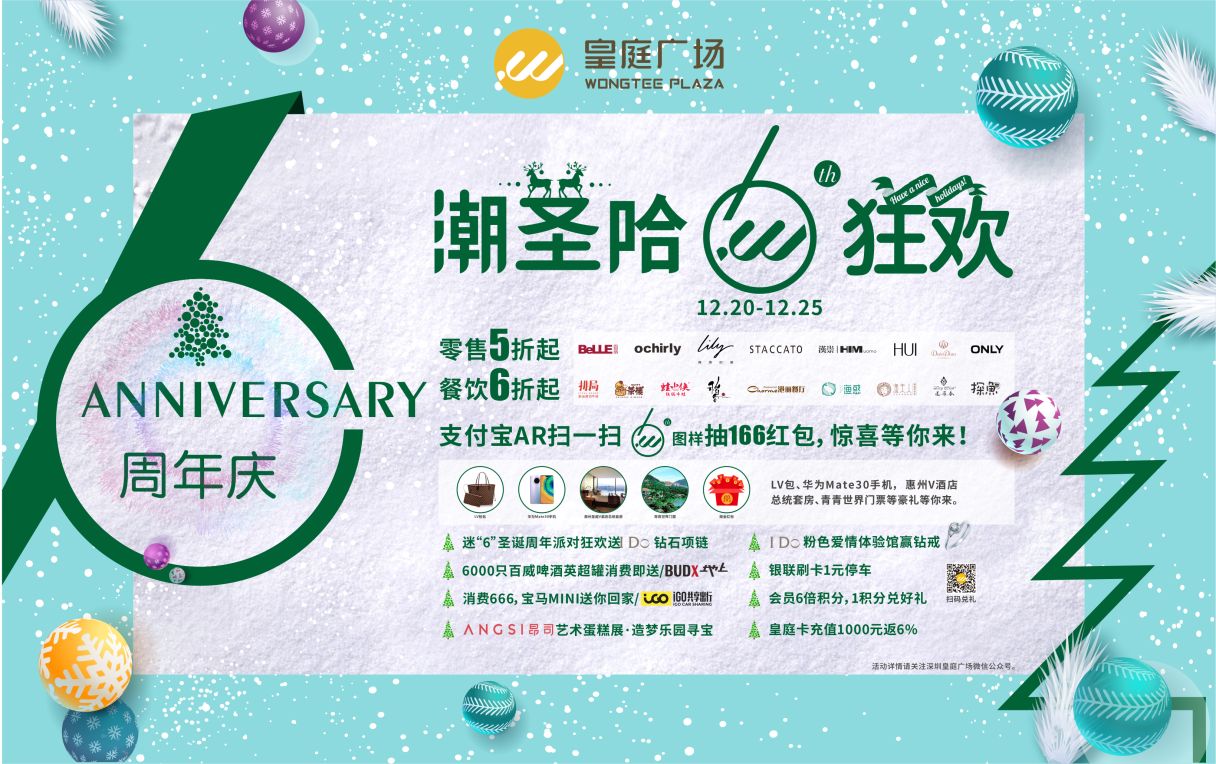 六周年慶期間,深圳皇庭廣場攜手場內(nèi)200余家優(yōu)質(zhì)商戶、銀聯(lián)等進行資源合作,并通過自有小程序,組合線上引流包,啟動支付寶AR掃碼抽LV、華為手機、166元現(xiàn)金紅包及商戶百萬代金券驚喜;網(wǎng)紅餐飲、時尚零售折扣低至冰點;更有迷“6”周年派對狂歡送百萬好禮,寶馬MINI送回家等驚喜活動,期待與你在皇庭的光影空間里拉近距離,一起吃喝玩樂,嗨購潮玩,6周年的故事期待有你參與!