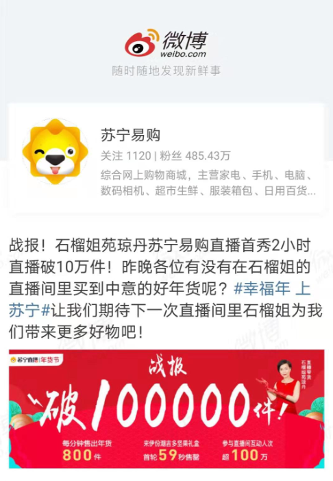 石榴姐蘇寧直播首秀兩小時帶貨超10萬件