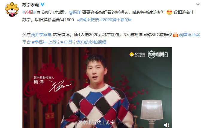 蘇寧代言人楊洋和江疏影也給大家?guī)砹瞬簧俑@?,粉絲們繼續(xù)喊話愛豆,“過年就差一個楊洋了,萬一實現(xiàn)了呢”。蘇寧家電直接開啟鼠運來襲模式,粉絲參與微博互動,就有機會獲得2020元蘇寧紅包,還能獲得楊洋同款SKG按摩儀。