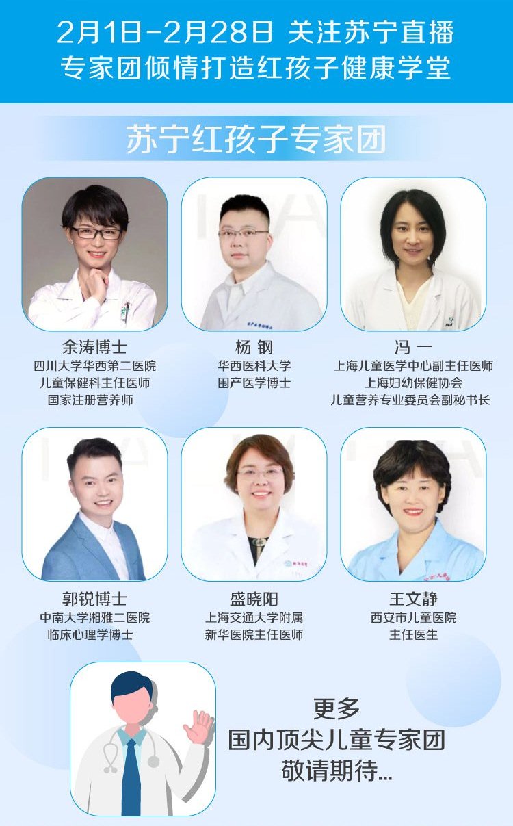 蘇寧紅孩子聯(lián)合惠氏、雀巢、佳貝艾特、美贊臣、伊利,邀請到北京協(xié)和醫(yī)院、、上海交通大學附屬新華醫(yī)院、廣州市婦女兒童醫(yī)療中心、中南大學湘雅二醫(yī)院、華西醫(yī)科大學、華西第二醫(yī)院、首都醫(yī)科大學附屬北京婦產醫(yī)院、上海交通大學醫(yī)學院附屬國際和平婦幼保健院等醫(yī)院的主任醫(yī)師以及醫(yī)科大學的醫(yī)學博士組成專家團,通過蘇寧直播為孕產婦直播講解孕媽乳媽、兒童防護措施,以及如何避免寶寶交叉感染的防護措施和建議。