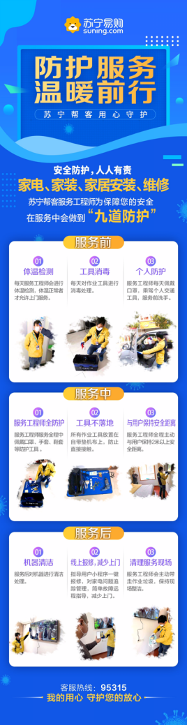 據(jù)悉,蘇寧家電“九道防護”措施涵蓋服務(wù)的前、中、后期全程。服務(wù)前,蘇寧服務(wù)工程師需進(jìn)行體溫檢測,衣物工具車輛消毒,同時佩戴口罩;服務(wù)過程中,需佩戴口罩、手套、鞋套等全套防護工具,并主動與用戶保持2米的安全距離,避免直接接觸;服務(wù)完成后,對機器進(jìn)行清潔處理,同時指導(dǎo)用戶關(guān)注報修和故障求助,帶走作業(yè)垃圾。