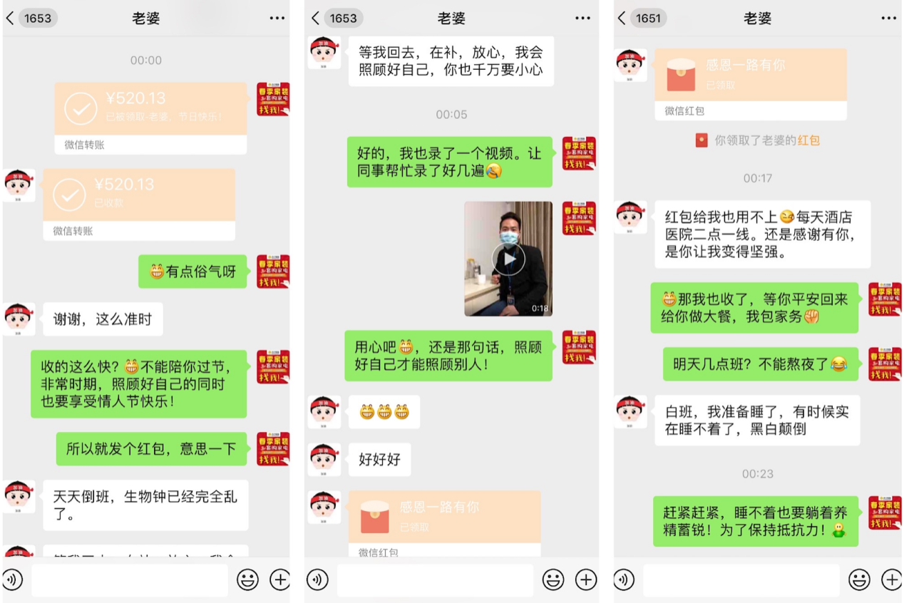 妻子也回贈(zèng)了紅包,說(shuō):“感謝有你,是你讓我變得堅(jiān)強(qiáng)。”盡管疫情讓他們相隔千里,但愛(ài)情始終連接著彼此的心。
