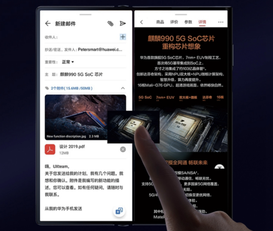 Mate Xs采用8英寸顯示屏,分辨率為2480×2200,折疊時(shí),屏幕尺寸為6.6英寸,分辨率為2480×1440。展開狀態(tài)下,華為Mate Xs充分發(fā)揮突破視野的視覺空間優(yōu)勢(shì),在瀏覽視頻、開啟閱讀、使用導(dǎo)航以及游戲影音時(shí),將獲得前所未有的視覺極限與沉浸體驗(yàn)。此外,通過智慧分屏模式,可以同時(shí)顯示、運(yùn)行多個(gè)應(yīng)用程序,多窗口交互提升應(yīng)用體驗(yàn)及操作效率。這種智慧分屏模式提供平行視界、跨屏拖拽、懸浮窗、分屏快捷欄等高頻使用場(chǎng)景智慧生態(tài)操作。