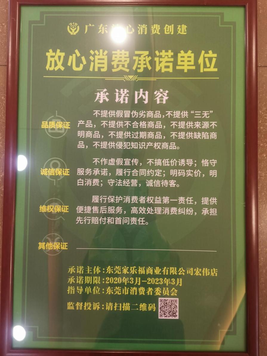 家樂福根據(jù)《經(jīng)營者“放心消費承諾”活動規(guī)則(試行)》向社會公開作出品質(zhì)保證、誠信保證和維權(quán)保證的“三大承諾”,承諾不提供假冒偽劣商品,不提供“三無”產(chǎn)品;不作虛假宣傳;履行保護消費者權(quán)益第一責任等,充分發(fā)揮放心消費承諾單位示范作用,深入推進放心消費創(chuàng)建活動,深化消費維權(quán)社會協(xié)同共治,營造安全放心的消費環(huán)境。