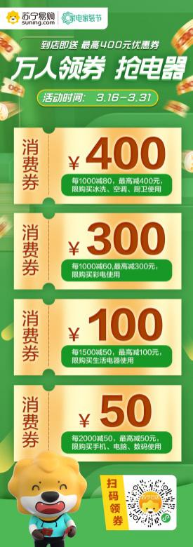 據(jù)了解,深圳蘇寧3月16日至3月31日期間放出大招,強勢推出“萬人領(lǐng)券搶電器”活動,攜手空調(diào)、廚衛(wèi)、冰洗、彩電、3C數(shù)碼和生活電器全品類百大品牌全面發(fā)力,以千萬補貼讓利回饋消費者。針對整個粵東區(qū)域限量投放近20萬張400元、300元、100元、50元不等的家電消費券,在活動前期通過社群、門店、金牌V購等線上線下即可領(lǐng)取,在粵東區(qū)域所有蘇寧門店及V購均可使用。