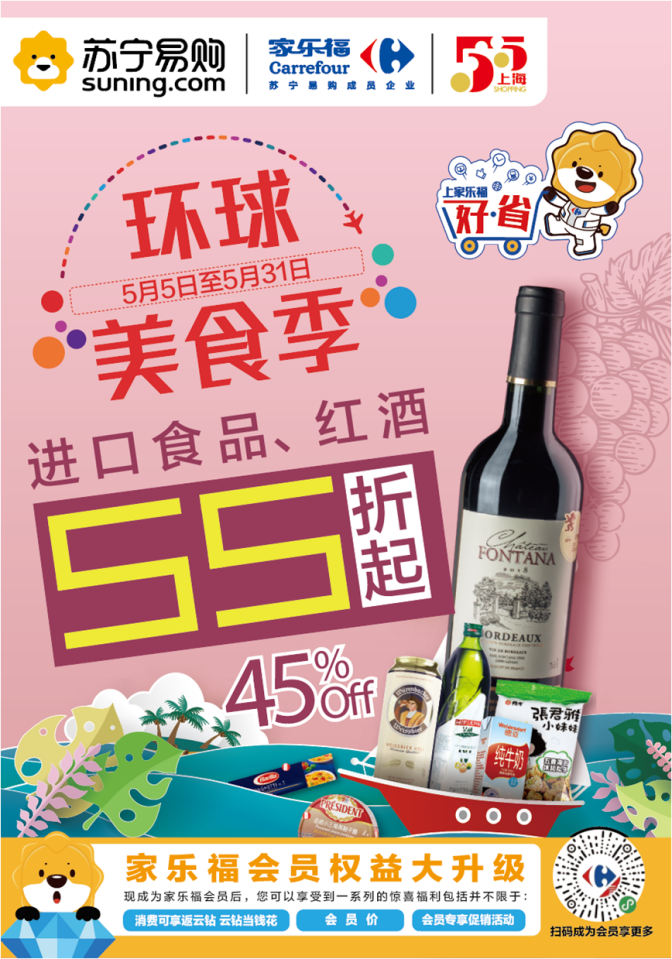 此外,家樂福方面還宣布將加大投入,全面支持上?!拔逦遒徫锕?jié),全城打折季”。5月5日至31日,上海地區(qū)家樂福門店將開啟“環(huán)球美食季”,精選來自法國、意大利、英國、西班牙、美國、加拿大、日本、韓國、馬來西亞等39個(gè)國家的350個(gè)品牌旗下共計(jì)3700多種進(jìn)口食品,與上海消費(fèi)者共襄盛舉。美食自然少不了美酒相伴,來自法國、意大利、西班牙、阿根廷、智利、澳洲等國家的70多個(gè)品牌旗下共計(jì)200多種進(jìn)口葡萄酒,也將悉數(shù)亮相全市家樂福門店。活動(dòng)期間,進(jìn)口食品低至5.5折起,進(jìn)口紅酒買一送一。進(jìn)博會(huì)“同款”法國奧格斯汀系列葡萄酒也將首次參與促銷,葡萄酒愛好者不容錯(cuò)過。