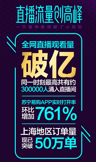 22點(diǎn)30分,直播正式進(jìn)入蘇寧時(shí)間。江疏影化身蘇寧“福利官”與主持人周瑾在線安利蘇寧好物,直播吸引在線觀眾上億人次圍觀“剁手”,同一時(shí)刻最高峰30萬人涌入直播間。