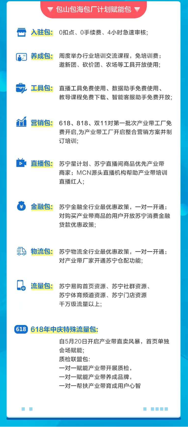 為了扶助產(chǎn)業(yè)帶商戶快速成長,蘇寧拼購發(fā)布了“包山包海包廠”賦能包,從物流、金融、營銷、直播、工具等多個角度扶助產(chǎn)業(yè)帶商戶。